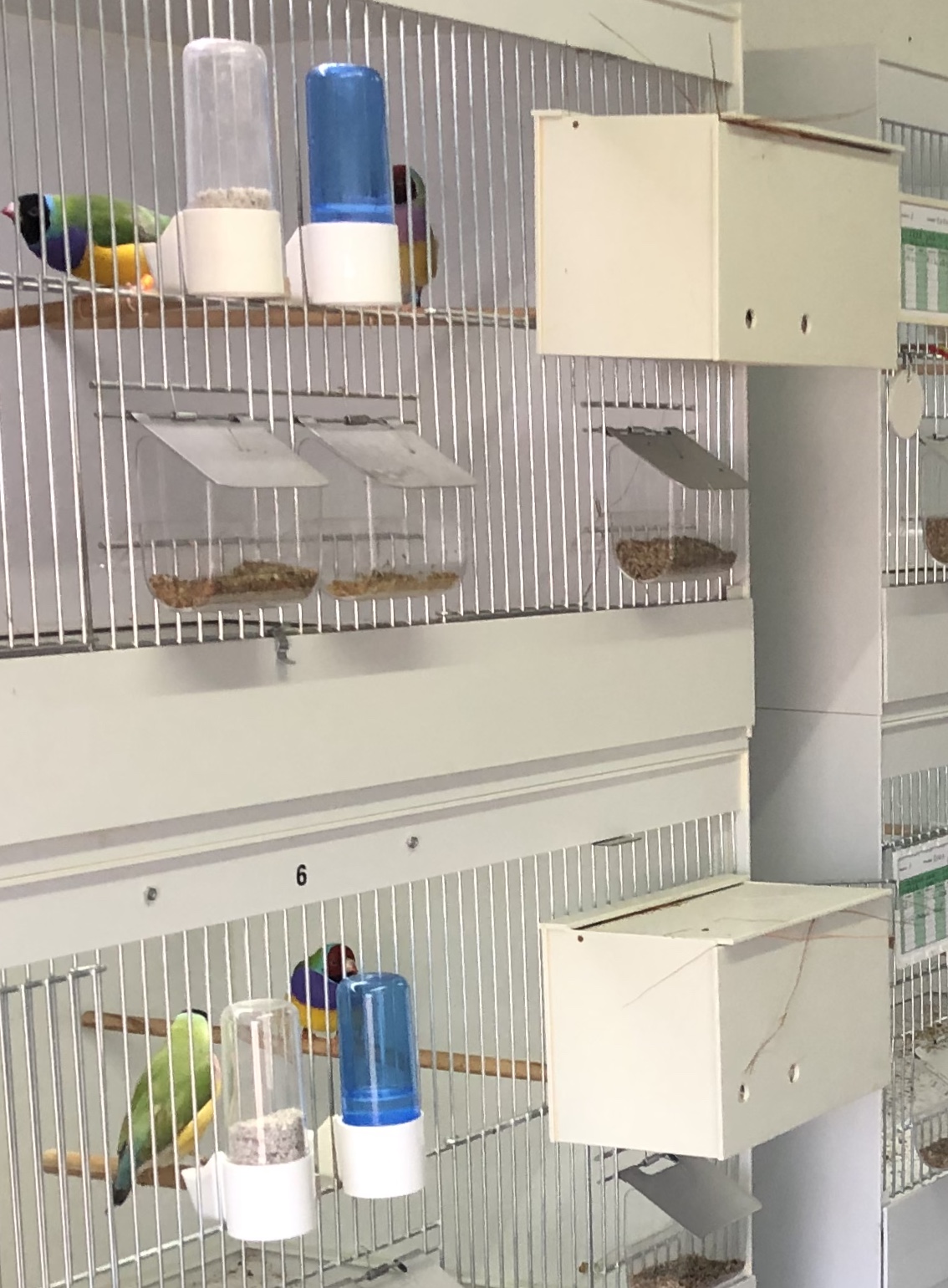 In het vogelverblijf die in 2 slaapkamers verdeeld zijn, staan 24 kooien van 80x40x40cm met een losse tussenschot zodat hij uitvliegkooien van 160x40x40 cm van kan maken. Van de 24 st. kooien worden 20 kooien voor de kweek gebruikt. Deze kweekkooien zijn voorzien van G&O kunststof nestkastjes. Er staan 4 uitvliegkooien van 200x50x50 cm en 4 kooien van 100x40x50 cm. Deze kooien zijn voor de jongen en wat extra 1-jarige vogels bedoeld.